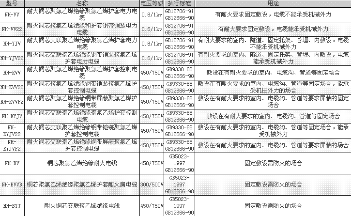 本產品適用于固定敷設需防火的場合。如高層建筑、地下鐵道、核電站、發電廠、機場、油田、化工廠及重要的工礦企業等與消防救生有關場合,同時又是應急電源、消防泵、電梯、通訊信號系統必備電纜。型號和M稱: