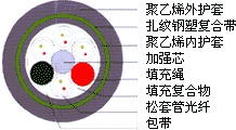 產品型號: GYSTY53也叫(GYTY53) 光纖松套 纜芯填充油膏 金屬中芯加強PE內護套 雙面涂塑軋紋鋼帶粘結PE外護套